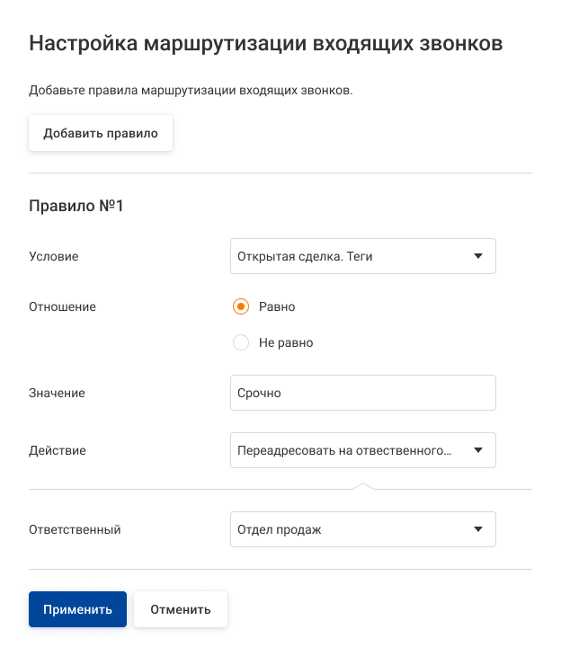 Умная маршрутизация автоматически направляет входящий звонок нужному сотруднику или отделу, используя теги из карточки клиента, компании или сделки, а также учитывает рабочее время. Вы можете гибко настроить маршрутизацию под свои задачи.
