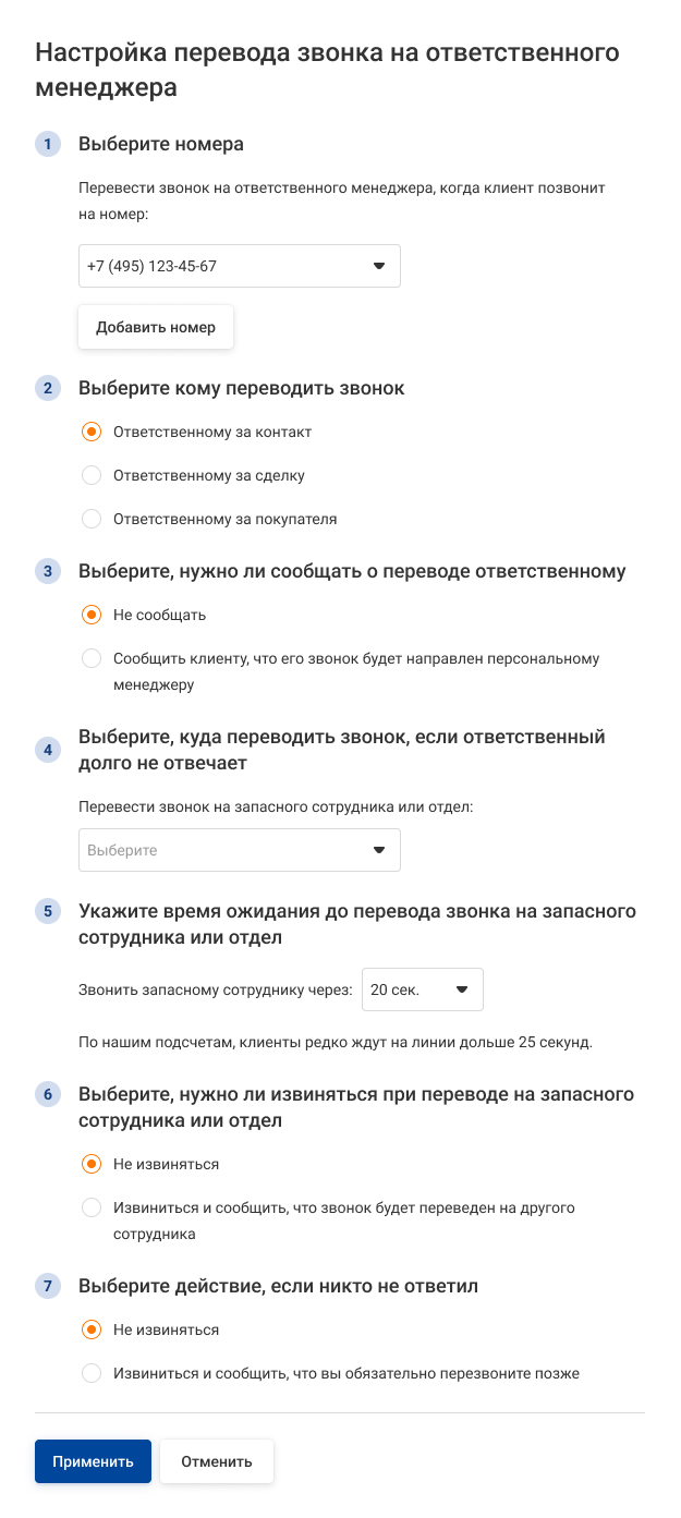 Если ваша компания использует несколько номеров, вы можете настроить сценарии работы в amoCRM для всех номеров сразу или для каждого в отдельности.