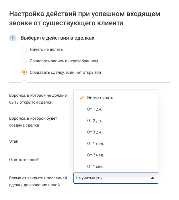 3. Настройте период ожидания после закрытия сделки, в течение которого дубли не будут создаваться в amoCRM при звонке от текущего клиента.