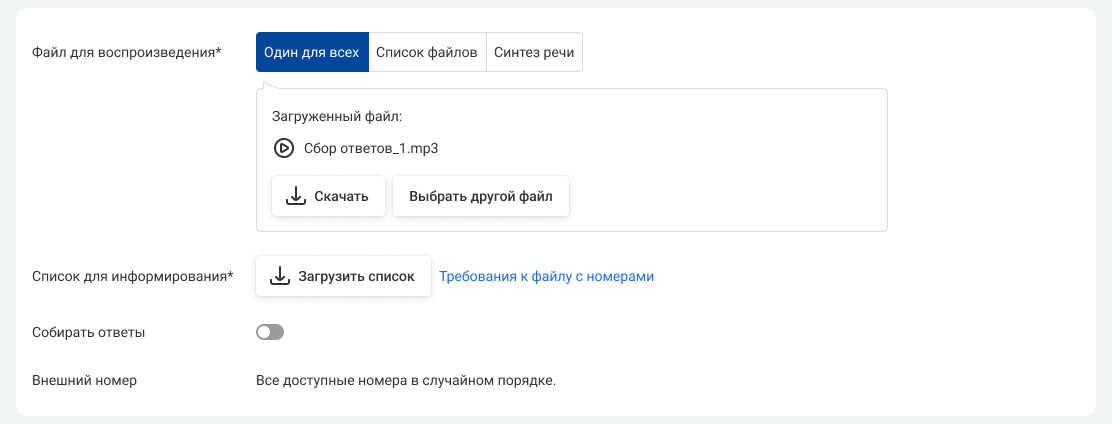 Если вы не настраиваете переадресацию на внешний номер или SIP URI, то добавьте голосовое приветствие для клиентов. Так, при звонке на номер автоинформирования клиенты смогут сами выбрать дальнейшие действия в голосовом меню или удостоверятся, что АТС больше не будет их обзванивать, если при звонке номер автоматически добавляется в список отписавшихся. Можно загрузить готовый аудиофайл или воспользоваться синтезом речи.