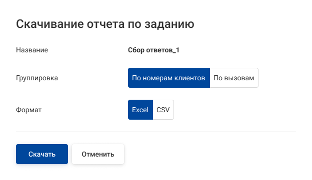 Автоинформирование позволяет не только автоматизировать процесс обзвона, но и получить от клиентов обратную связь, не привлекая к этому сотрудников. Благодаря этой настройке можно прямо в процессе автоинформирования задать клиентам вопрос, на который они смогут ответить, нажав кнопку на телефоне. Результаты опроса будут собраны в информативный отчет в виде таблицы, которую можно скачать и проанализировать.