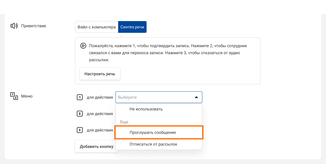 - Прослушать сообщение – после нажатия этой кнопки клиент услышит голосовое сообщение, аудиофайл для которого вы можете загрузить или создать с помощью функции «Синтез речи» в АТС.