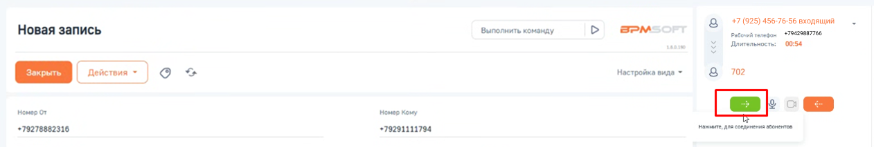 Если у вас настроен безусловный перевод, то после этого действия звонок будет переведен коллеге. Но по умолчанию в BPMSoft используется перевод с уведомлением. В таком случае нужно сделать еще одно действие.