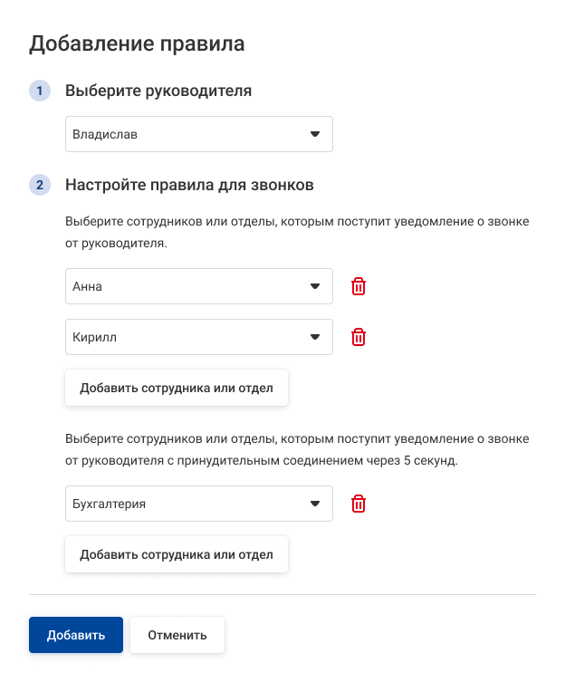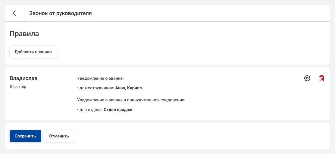 Готово! Теперь руководитель сможет в любой момент дозваниваться до выбранных в правило сотрудников и отделов.