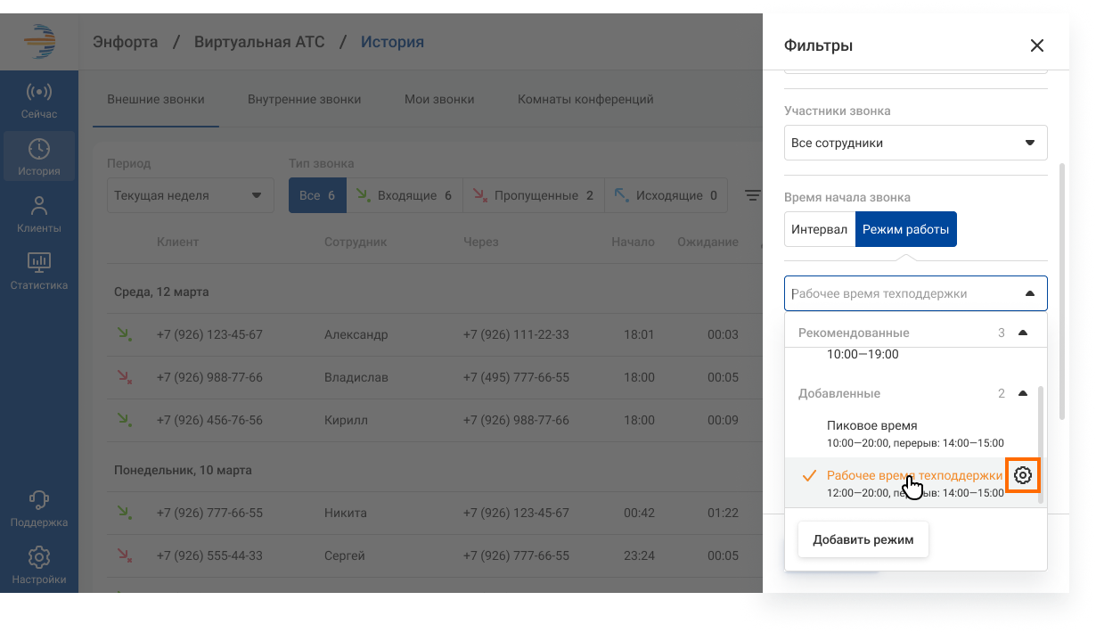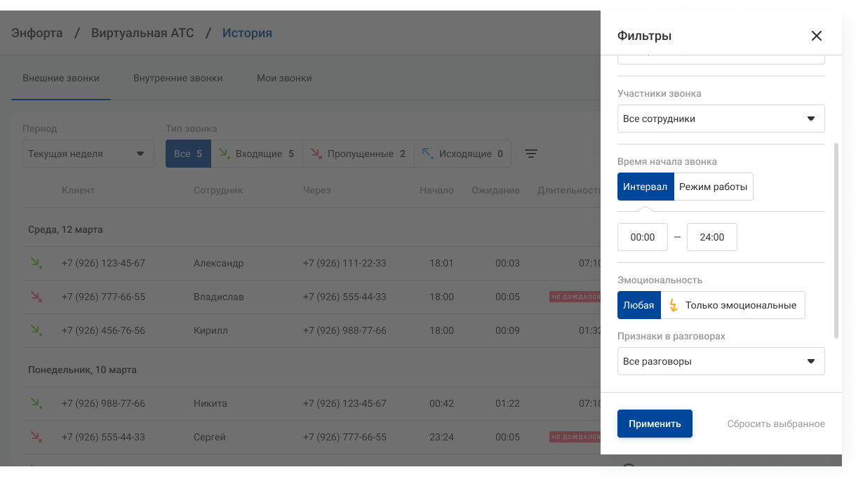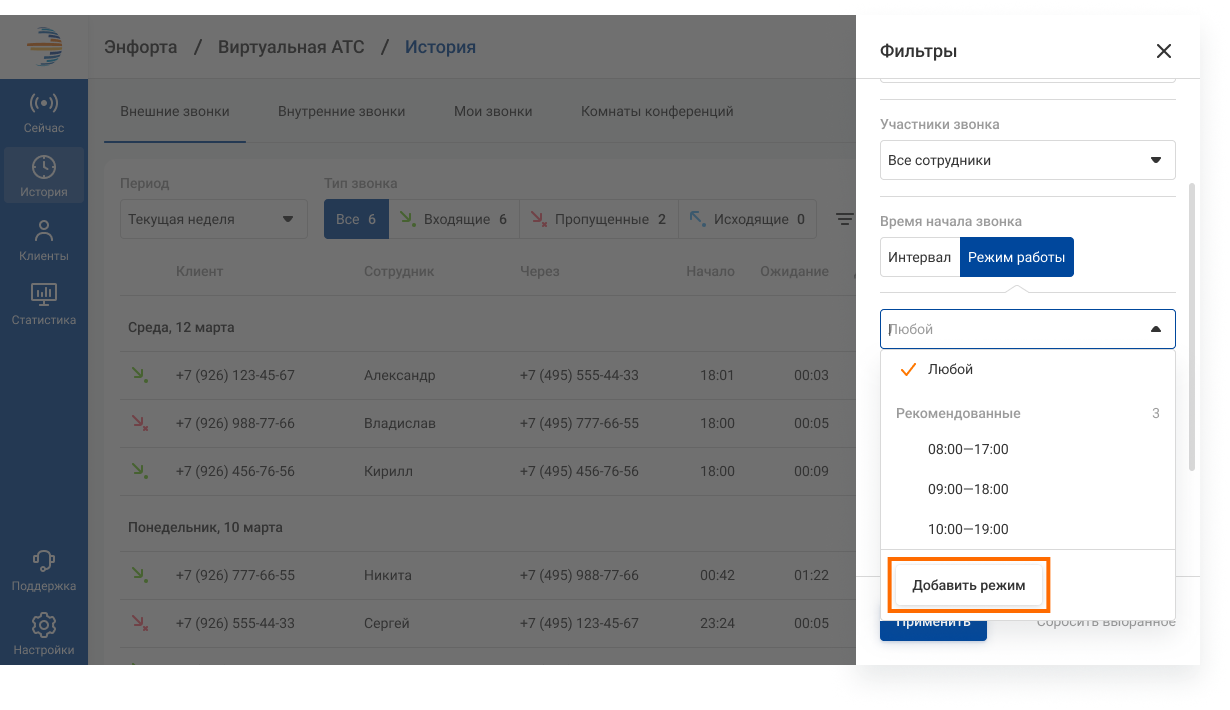 После настройки фильтра нажмите «Применить» внизу боковой панели с фильтрами. В Истории будут показаны звонки, которые начались во время выбранного режима работы.