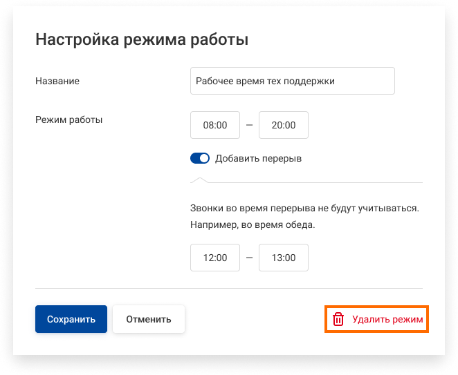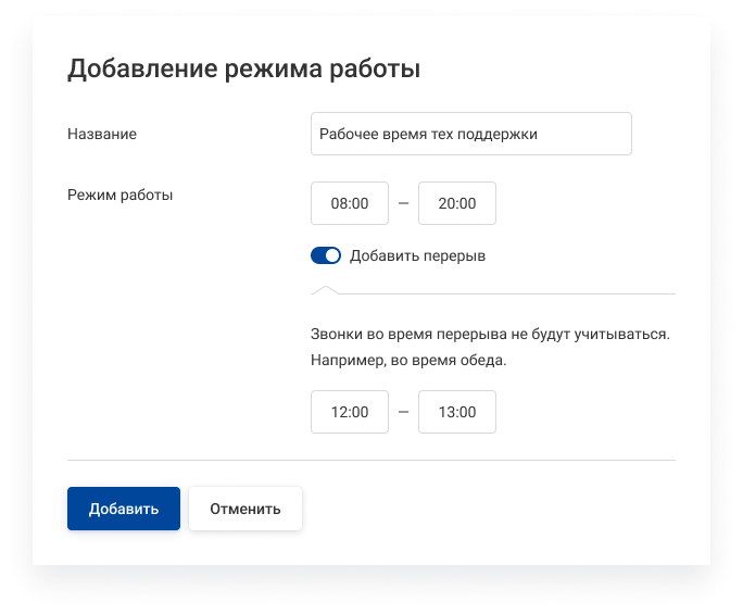 Также можно указать перерыв на обед. Для этого передвиньте вправо переключатель «Добавить перерыв» и укажите нужный интервал. Тогда при использовании фильтра фильтра «Время начала звонка» в Истории не будут показываться звонки, начавшиеся во время перерыва.