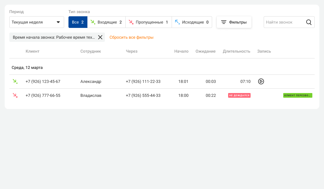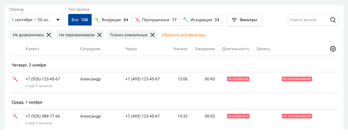 Фильтр «Контроль пропущенных» отображается в панели фильтров, когда выбраны типы звонков «Все», «Входящие» или «Пропущенные». При выборе типа звонков «Исходящие» фильтр «Контроль пропущенных» недоступен.Благодаря фильтру «Контроль пропущенных» вы сможете легко найти непринятые звонки, на которые сотрудники не перезванивали или не дозвонились.