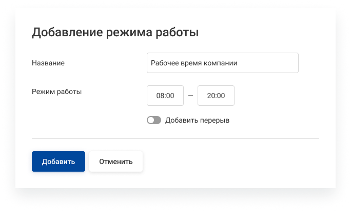 Создавать, редактировать и удалять режимы работы могут только Администраторы и Руководители отделов (а также Системные администраторы, если в АТС включена система филиалов). Просматривать режимы работы могут все, у кого есть доступ к Истории.Чтобы создать свой режим работы, нажмите на кнопку «Добавить режим».