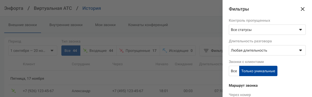 Также фильтр по уникальным звонкам показывает общее количество вызовов по каждому клиенту. Чтобы просмотреть полную историю общения с клиентом, кликните на его номер.