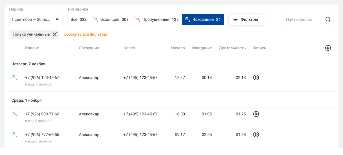 На вкладке «Исходящие» по количеству уникальных звонков вы поймете, сколько клиентов удалось обзвонить менеджерам.