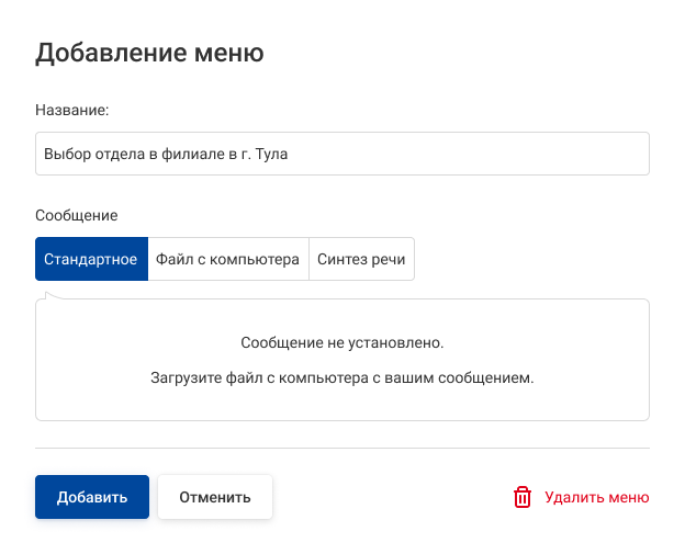 4. Голосовое приветствие настраивается отдельно для каждого уровня меню. Выберите приветствие для второго уровня меню и нажмите «Добавить».