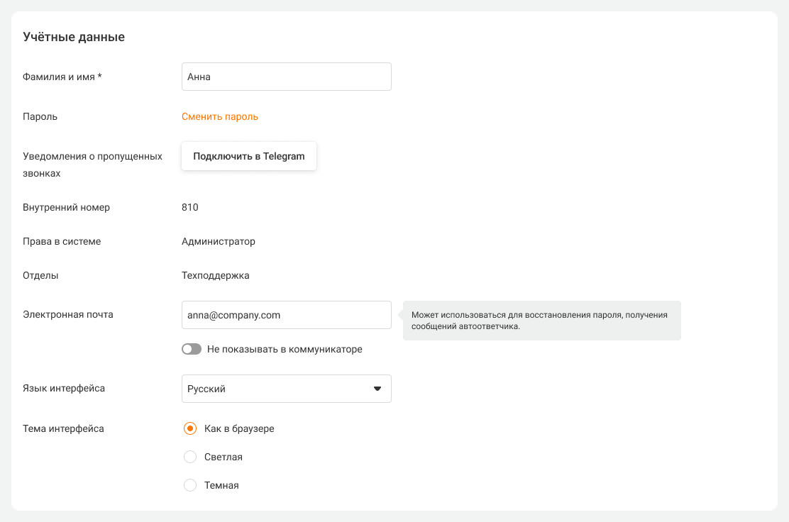 А также здесь указаны ваш внутренний номер, уровень прав в системе и то, как у вас настроены уведомления о пропущенных звонках.