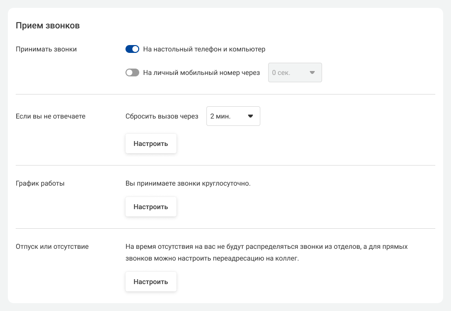 В блоке «Прием звонков» можно настроить важные критерии работы сотрудника, а именно: