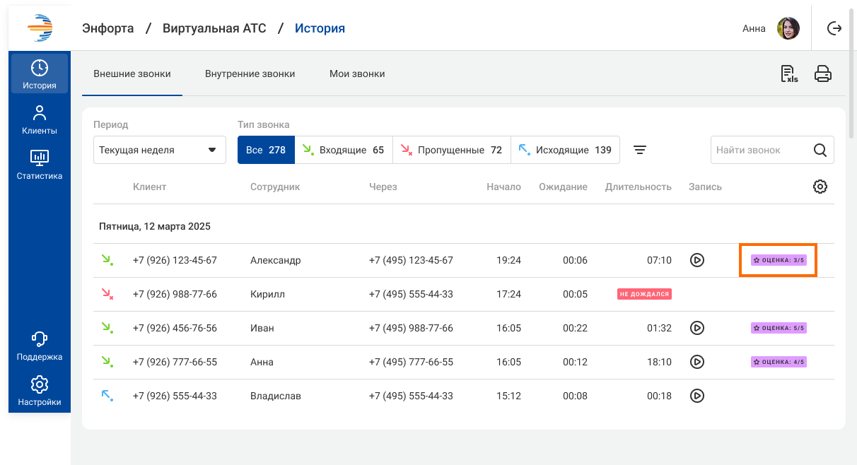 3. Оценка клиента сохранится в АТС и отобразится в разделе История.