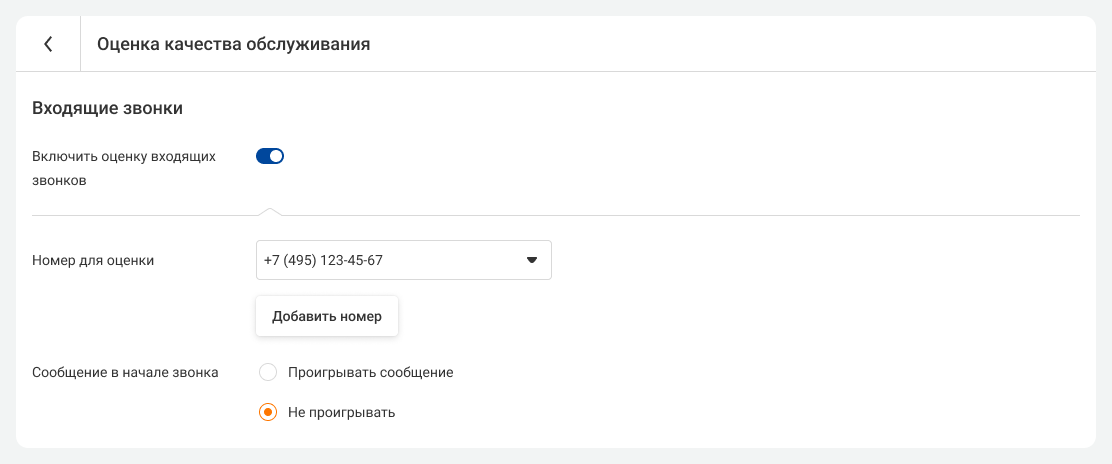 2. Включите оценку входящих звонков. В появившемся поле укажите номера АТС или номерные группы, на которые будут поступать вызовы, подлежащие оценке. Система будет автоматически предлагать клиентам оценить разговор после завершения беседы.