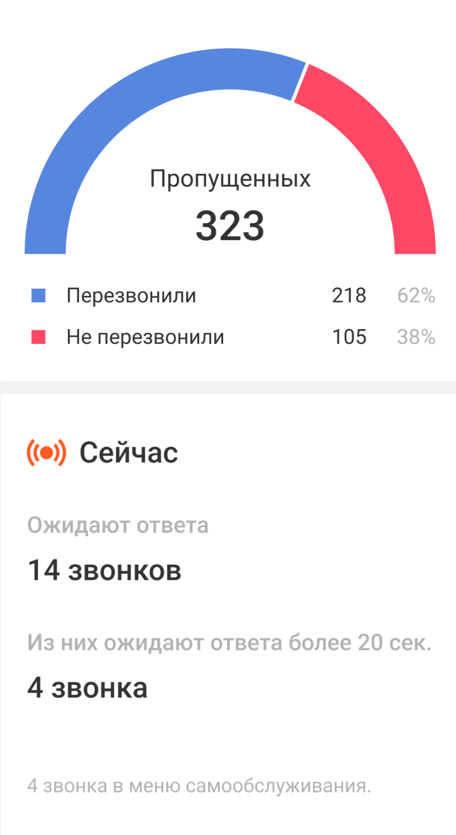 - перезванивают ли по пропущенным — по скольким из них успешно перезвонил сотрудник или сам клиент, а сколько непринятых вызовов осталось без ответа;