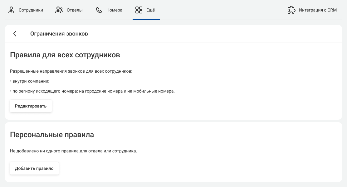 С помощью этих правил вы можете разрешить сотрудникам совершать звонки по определенным направлениям или запретить все исходящие вызовы, кроме внутренних и по региону номера.