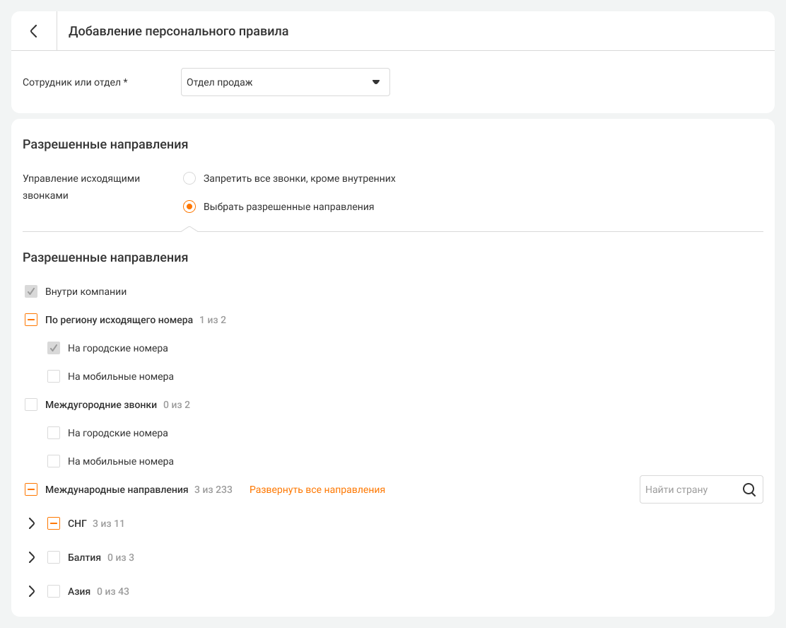 Выберите направления звонков, по которым сотрудники смогут совершать исходящие.