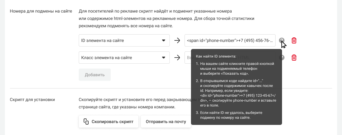 Скопируйте код для подбора номеров и установите его перед закрывающим тегом </head> на каждой странице, где требуется подбор номера. Для этого нажмите на кнопку «Скопировать код».