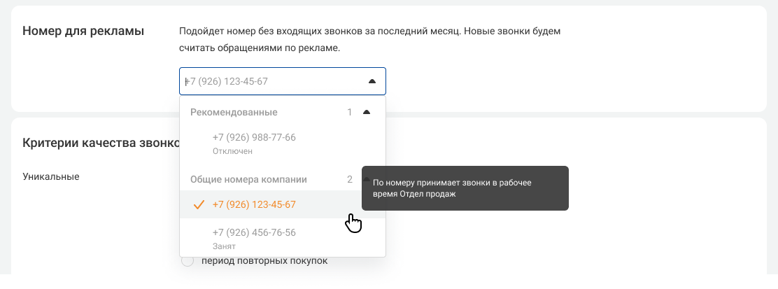 Вверху списка будут отображаться номера, на которые звонки не поступали в течение месяца. Мы рекомендуем использовать именно такие номера для коллтрекинга - это поможет получить более точную статистику по рекламе. Но, в целом, вы можете выбрать любой другой свободный номер. Если номер уже используется в другой рекламной кампании под ним будет указан статус «Занят».