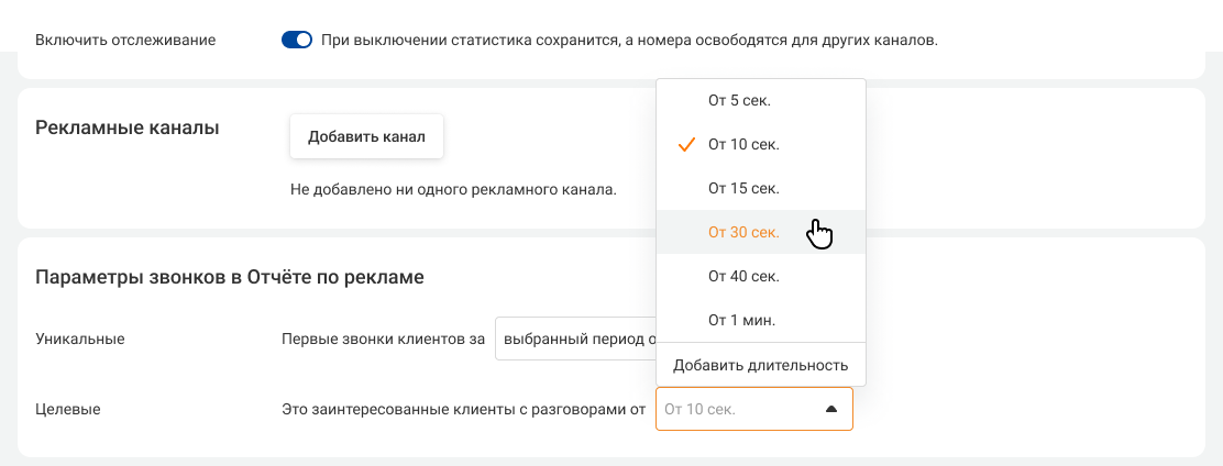 В блоке «Целевые звонки» выберите, звонки какой длительности стоит отслеживать в результатах рекламной кампании.