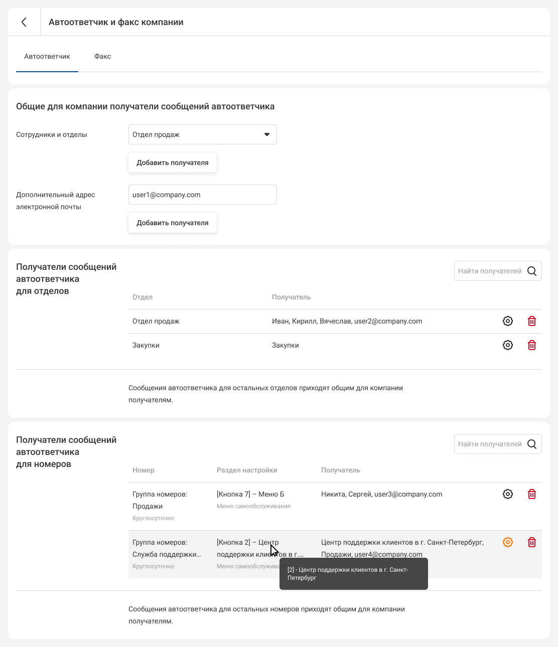 Чтобы изменить настройки, кликните на шестеренку справа от выбранного номера. В открывшемся окне вы можете добавить или удалить получателей автоответчика, а также указать дополнительные электронные адреса, куда будут отправляться голосовые сообщения.