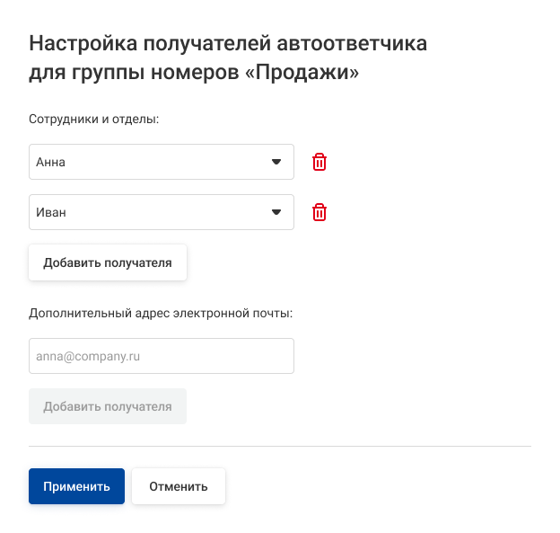 По умолчанию будет выбран общий автоответчик компании со списком получателей, который вы настраивали ранее. Чтобы изменить настройки автоответчика, в блоке «Получатели автоответчика» нажмите на кнопку «Настроить получателей».